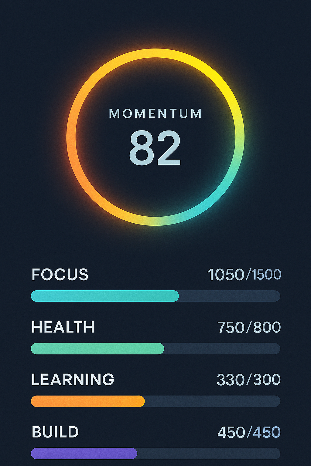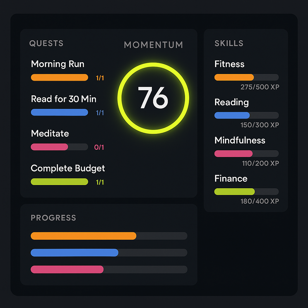 ArcBoard turns your day into clear quests. You will see today’s list, your skill levels, and a momentum meter (no streak shame) and a simple button for second takes.